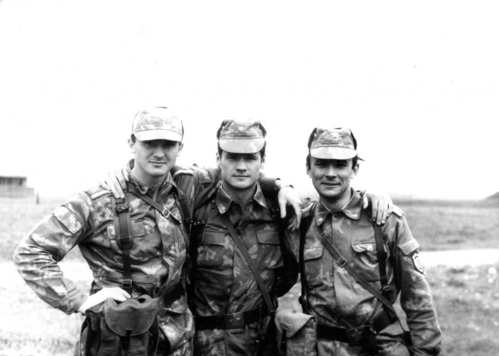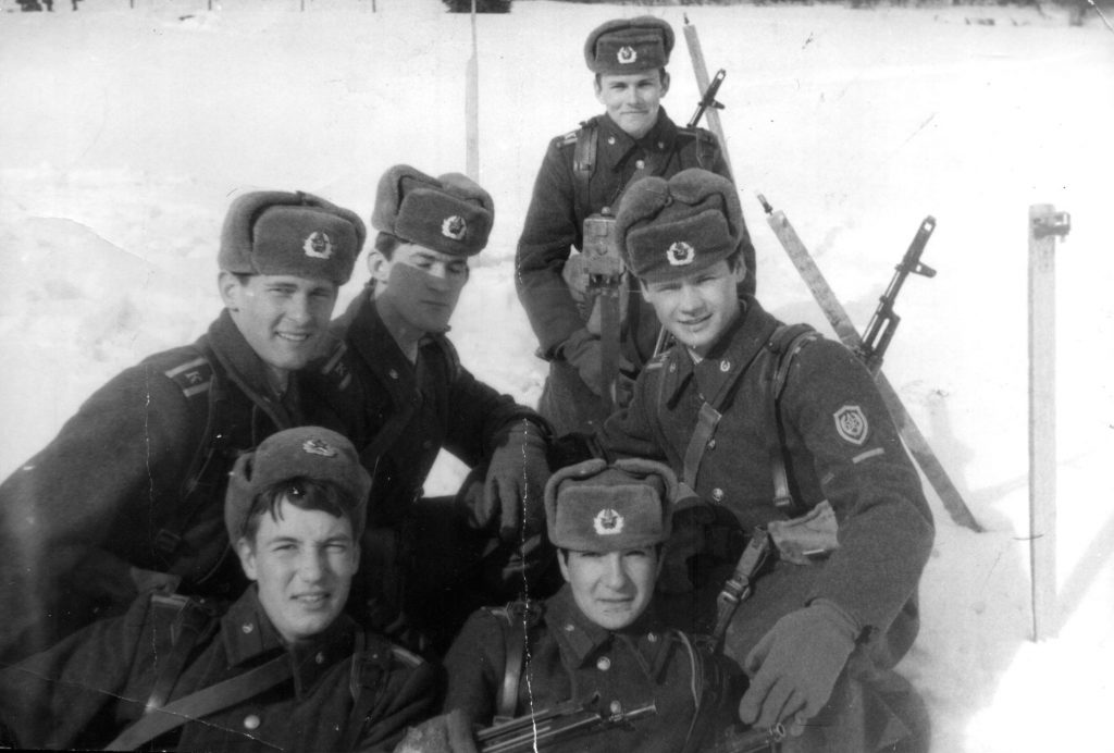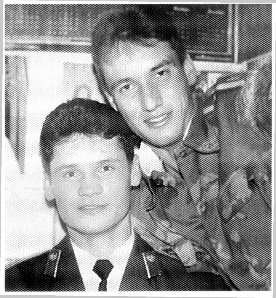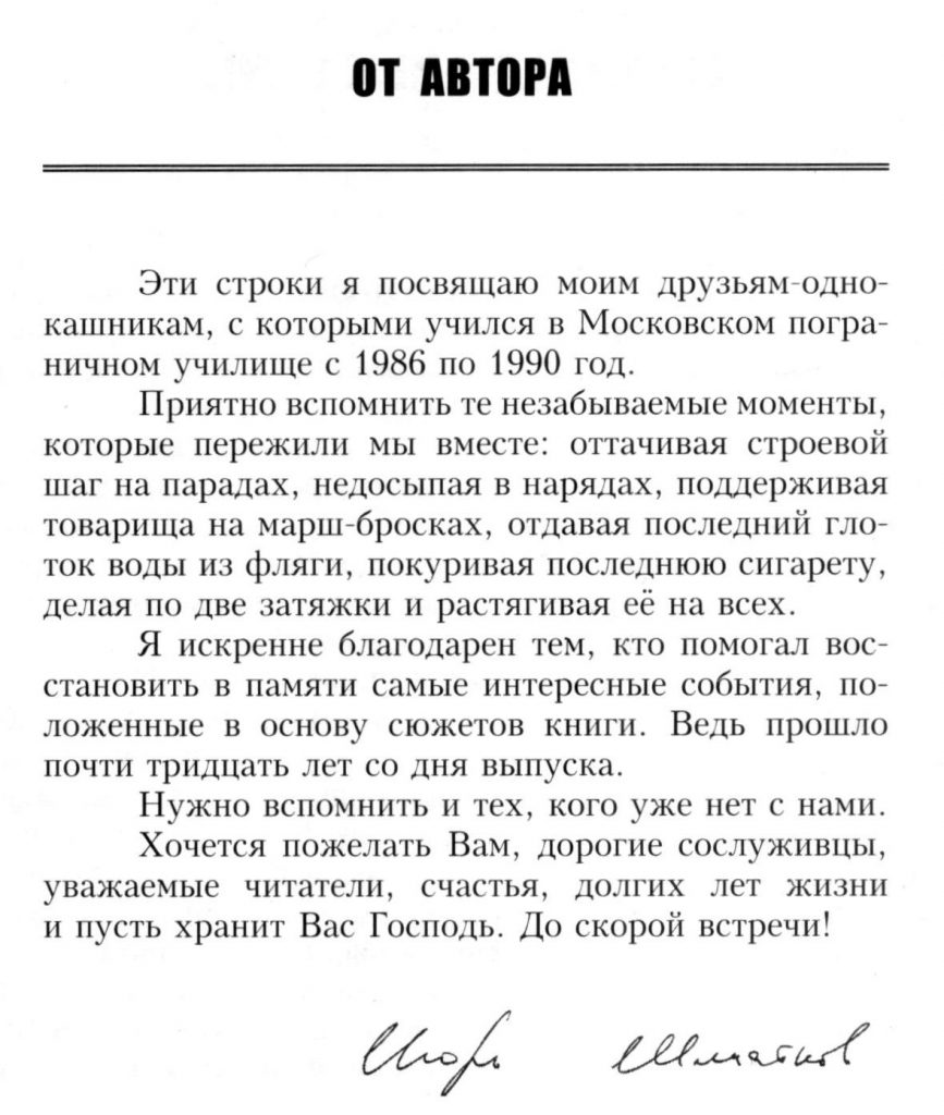 Фото с моими друзьями-однокашниками, с которыми учился в Московском пограничном училище с 1986 по 1990 год. Приятно вспомнить те незабываемые моменты, которые пережили мы вместе: оттачивая строевой шаг на парадах, недосыпая в нарядах, поддерживая товарища на марш-бросках, отдавая последний глоток воды из фляги, покуривая последнюю сигарету, делая по две затяжки и растягивая ее на всех. Я искренне благодарен тем, кто помогал восстановить в памяти самые интересные события, положенные в основу сюжетов книги. Ведь прошло почти тридцать лет со дня выпуска.